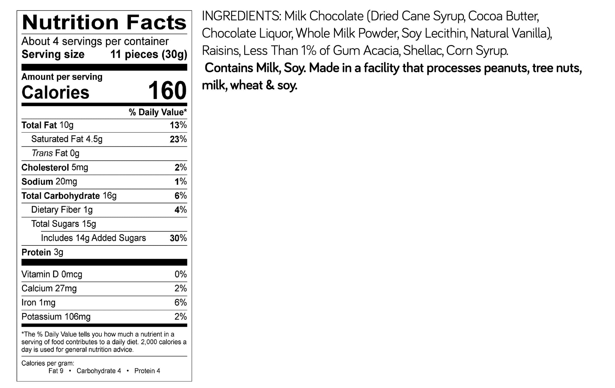 If a crunchy chocolaty snack isn’t what you are craving, chocolate covered raisins are a great sweet chewy alternative. The 4oz package is perfect for an afternoon snack and easy to throw in your bag.
