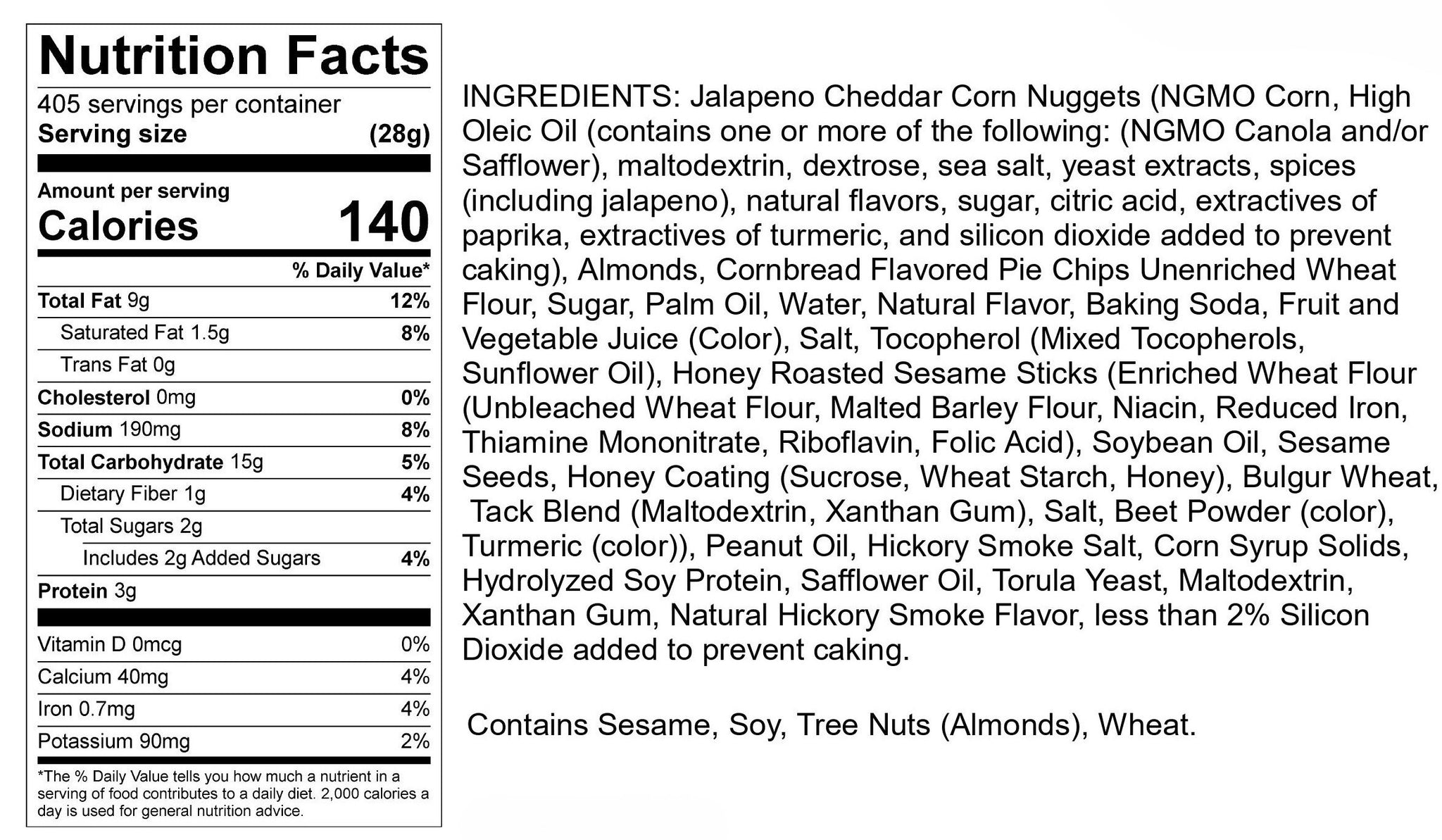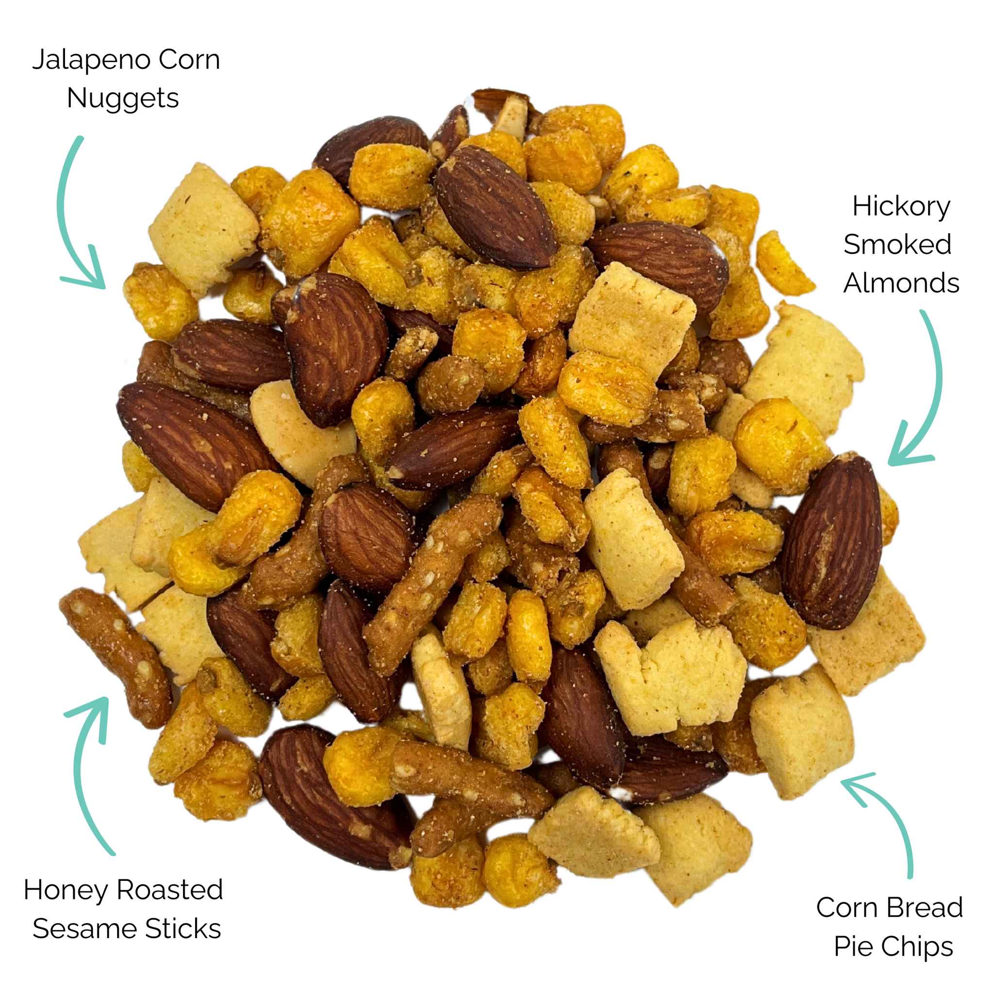 Spice up your snack time with our Jalapeño Cornbread Kick snack mix! A perfect blend of sweet, savory and spice, the mix includes Jalapeño Cheddar Corn Nuggets, Hickory Smoked Almonds, Cornbread Pie Pieces, and Honey Roasted Sesame Sticks.