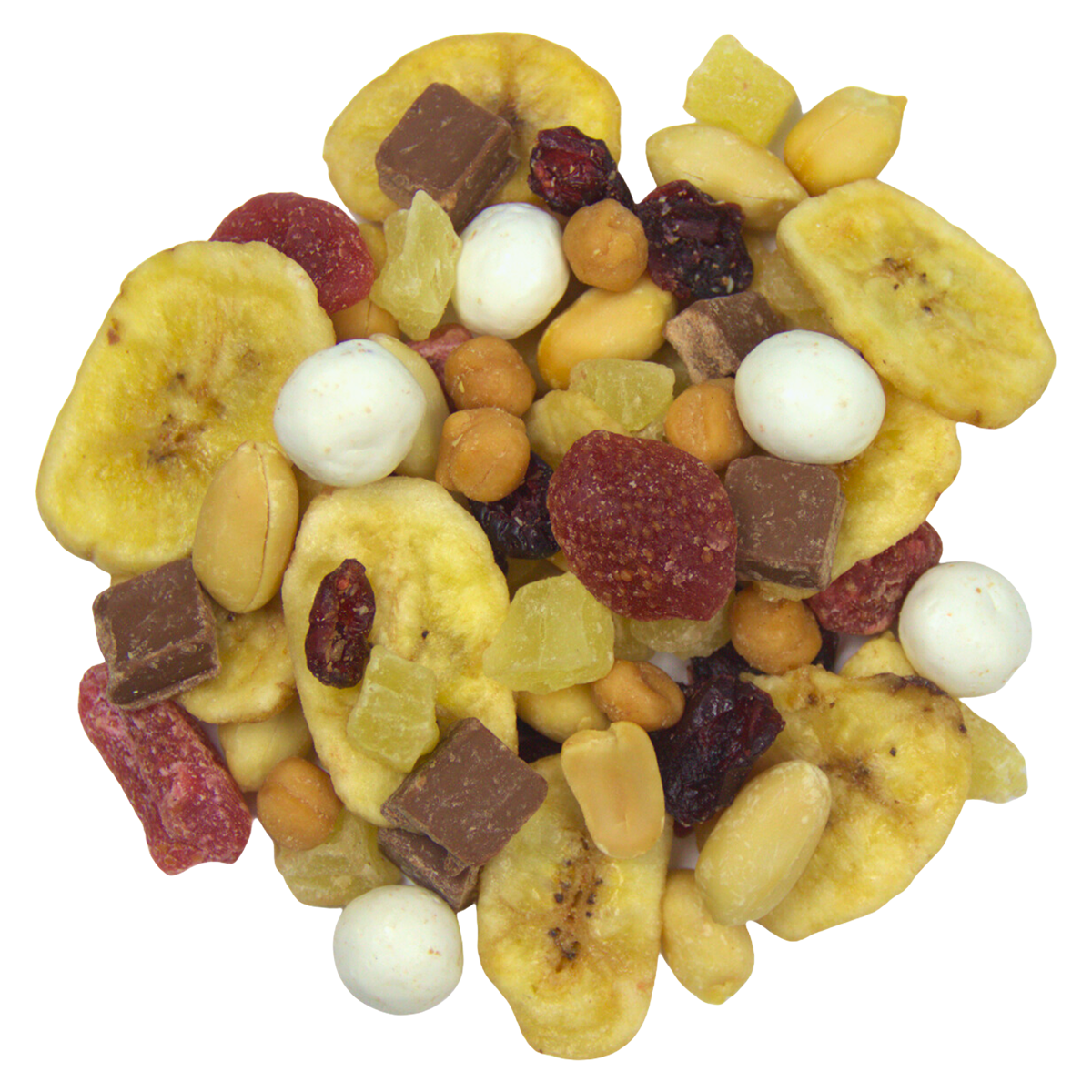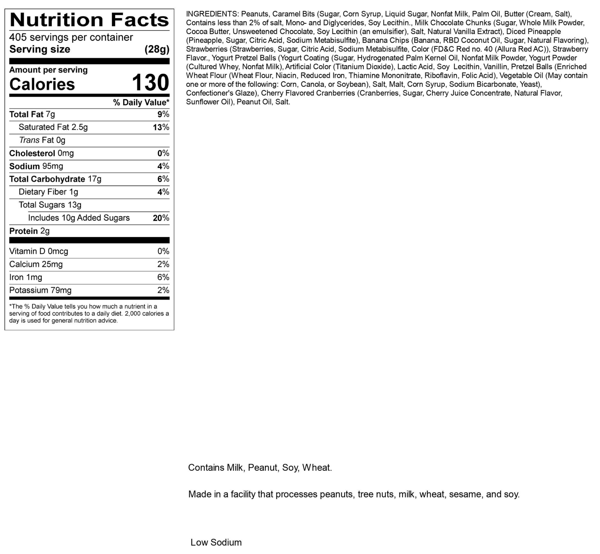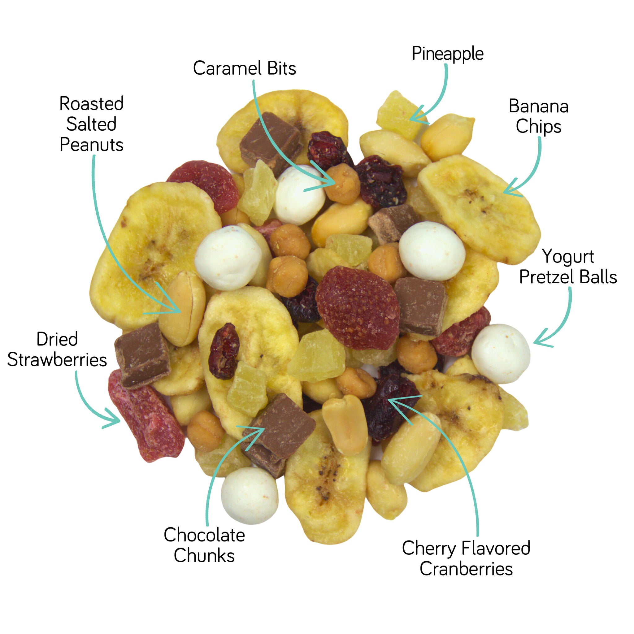 The sundae snack you crave! Banana Split includes roasted and salted peanuts, pineapple chunks, chocolate chunks, caramel bits, cranberries, banana chips, dried strawberries and yogurt pretzel balls. The 25lb box is perfect for small businesses or to share your favorite snack mix at home.