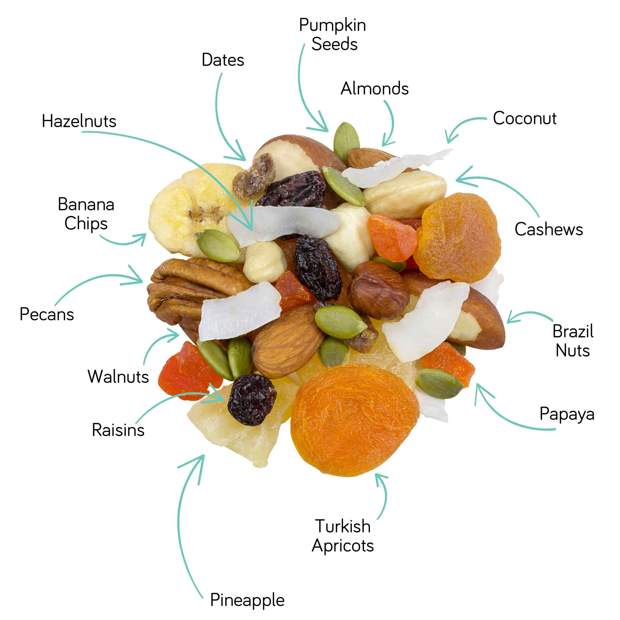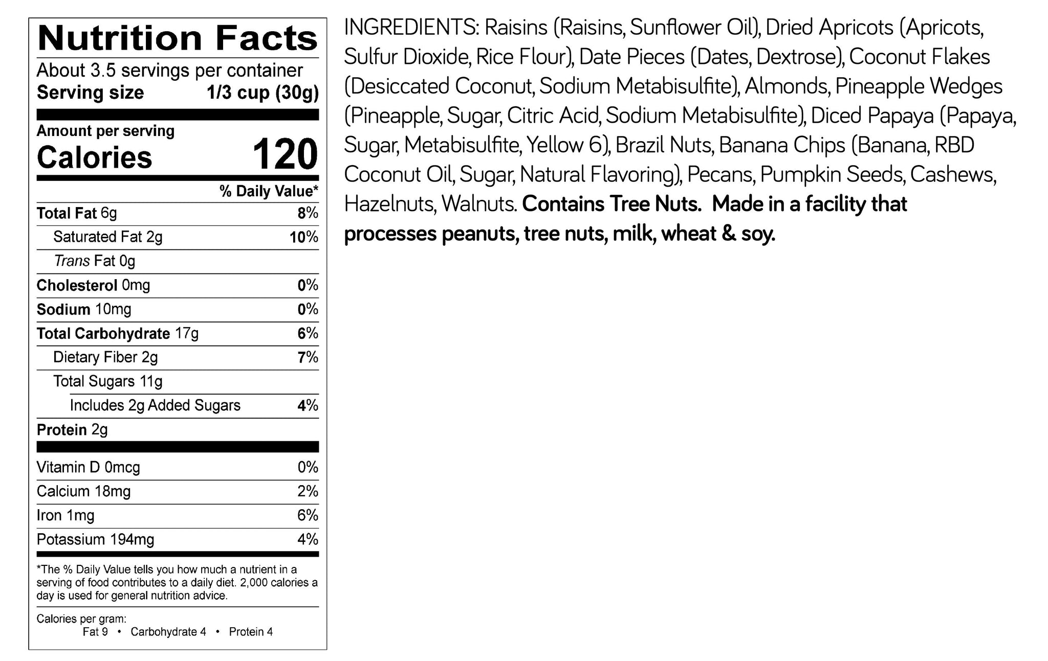 California Mix™ send your taste buds straight to the sandy beaches of California. This mix is combines raisins, Turkish apricots, date pieces, almonds, coconut flakes, papaya chunks, pineapple chunks, brazil nuts, banana chips, pecans, pumpkin seeds, hazelnuts, and walnuts.   The 3.5oz package is perfect for an afternoon snack and easy to throw in your bag.
