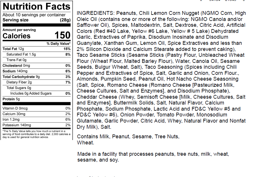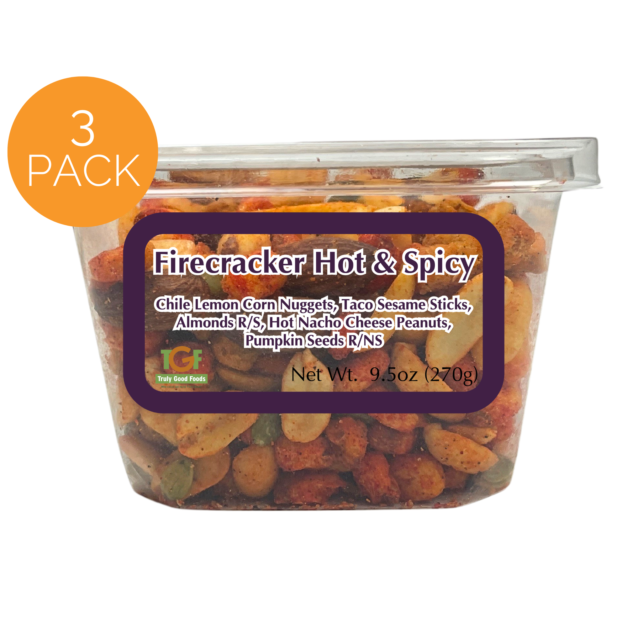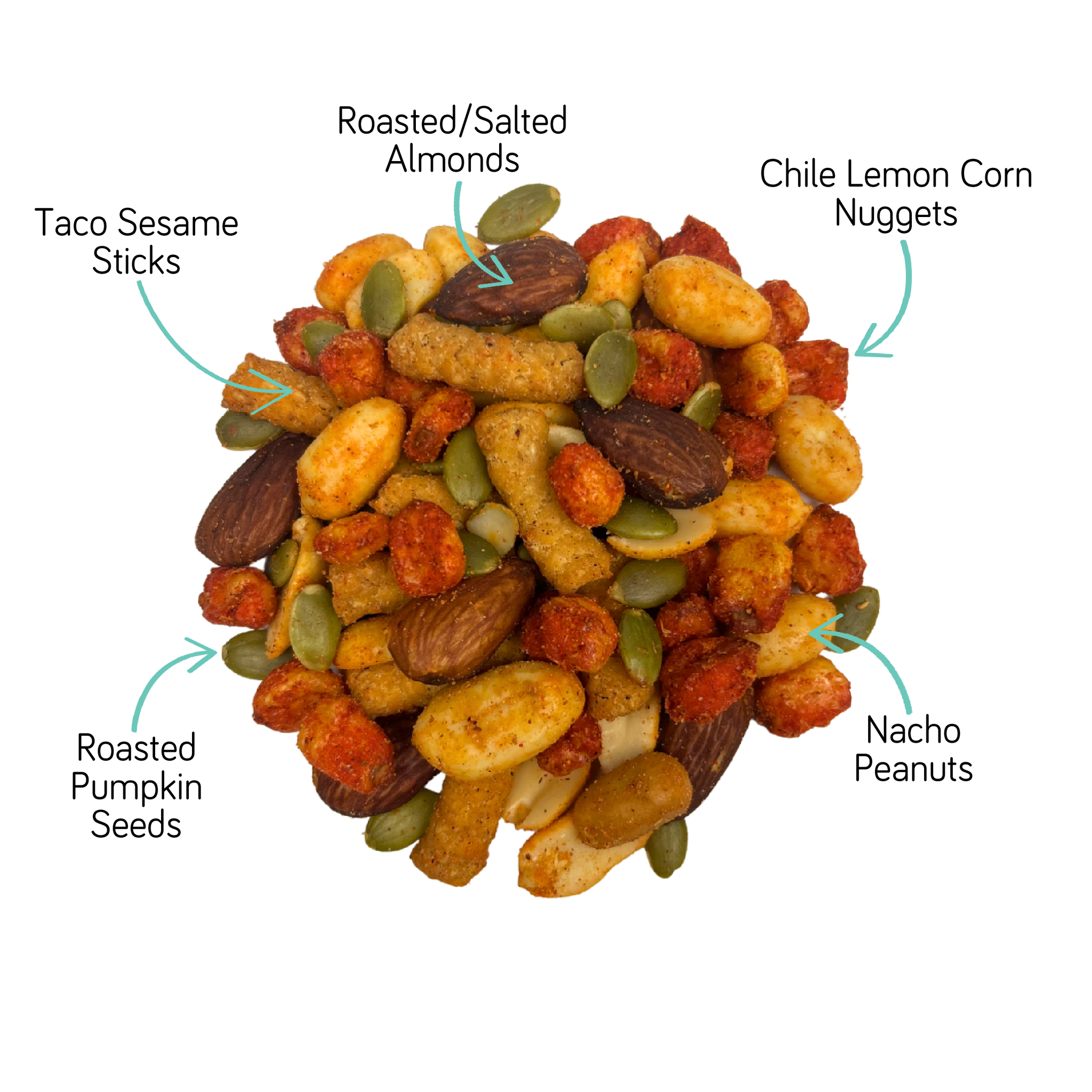 This spicy snack has a ton of different textures and flavors to make up one explosive mix. The mix includes nacho peanuts, Chile lemon corn nuggets (which resemble firecrackers and is where the name Firecracker Hot & Spicy® comes from), taco sesame sticks, roasted and salted almonds, and roasted, no salt pumpkin seeds.