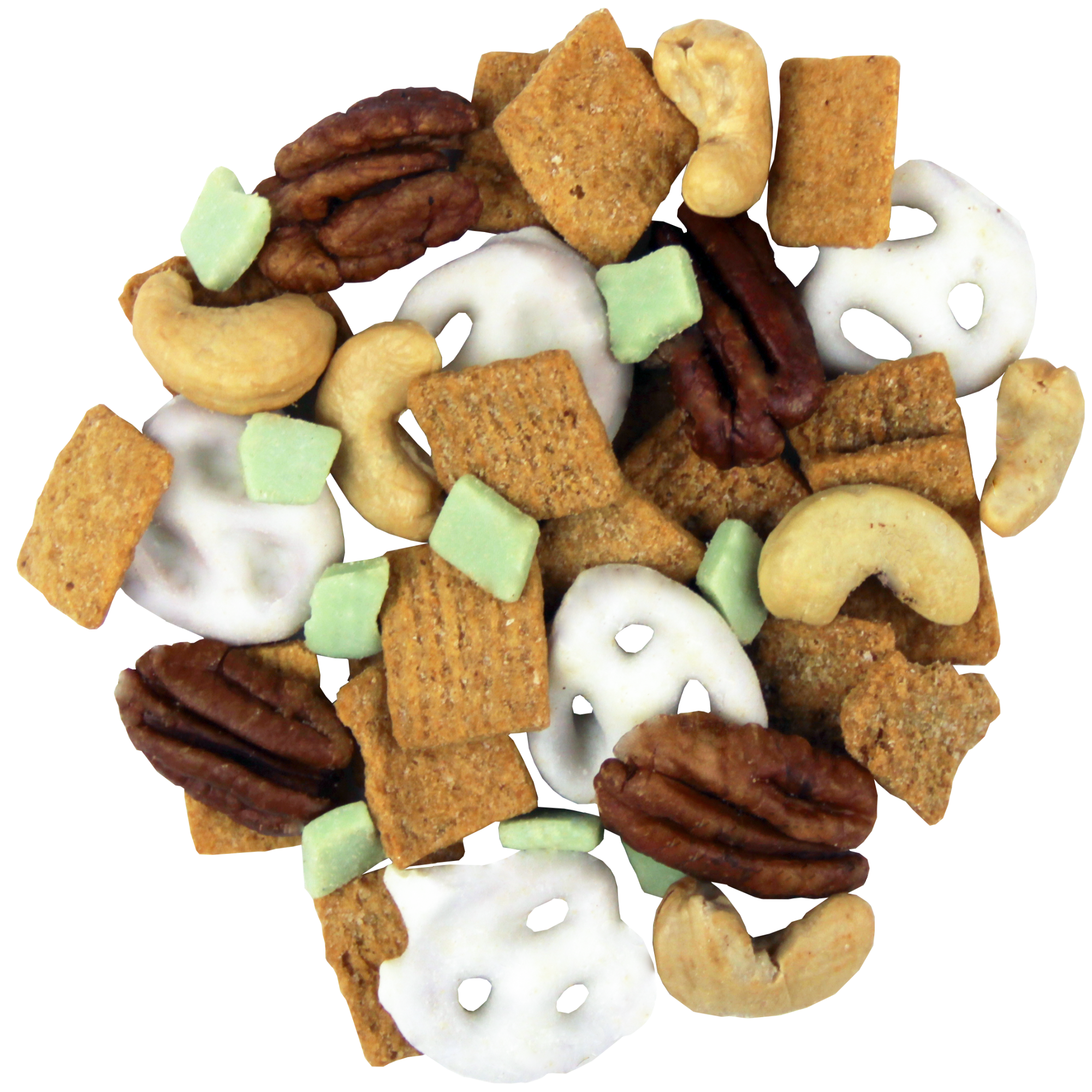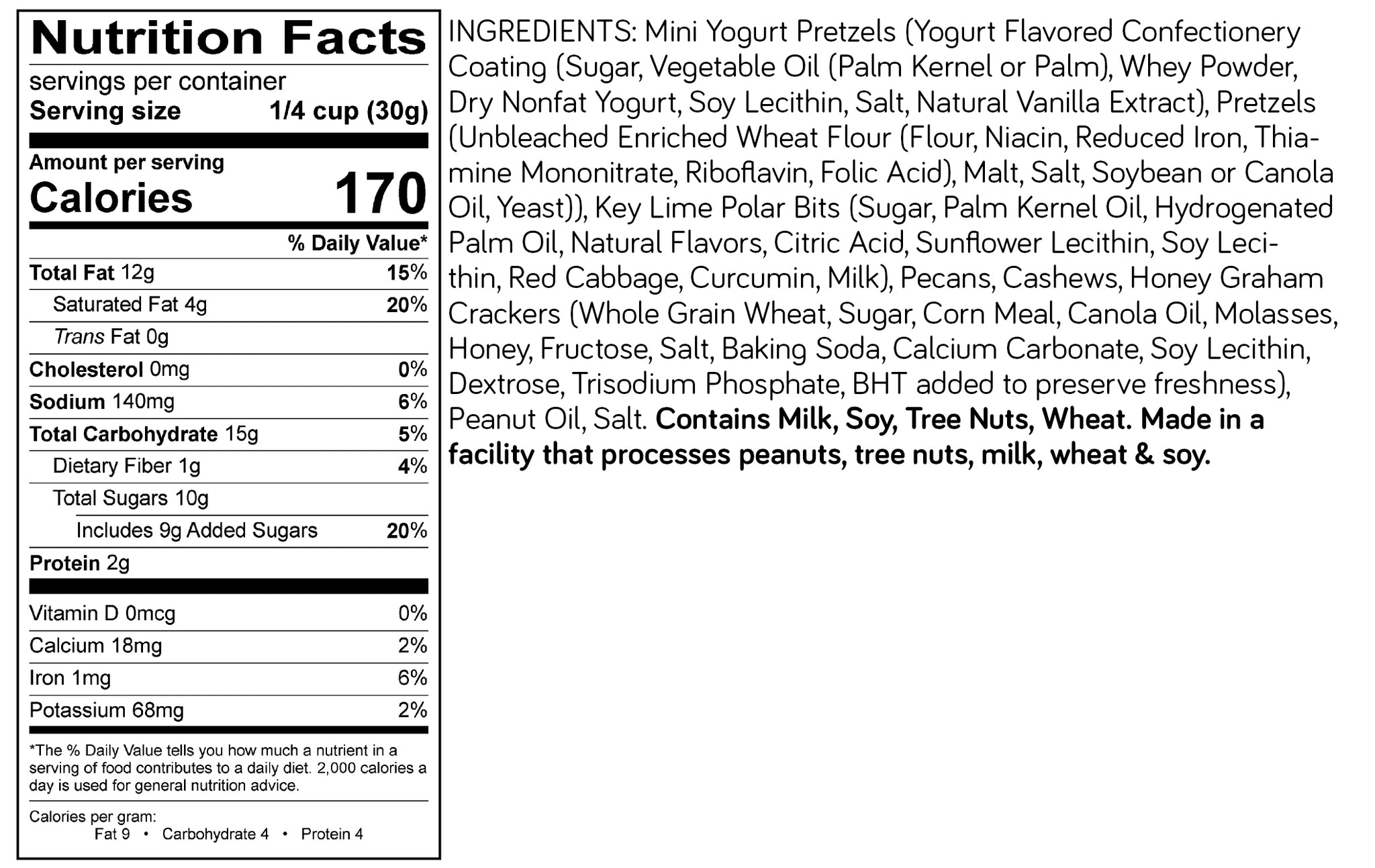 Key Lime Crunch includes Key Lime Bits, Mini Yogurt Pretzels, Roasted and Salted Pecan Halves, Honey Graham Toasters, and Roasted and Salted Cashews.