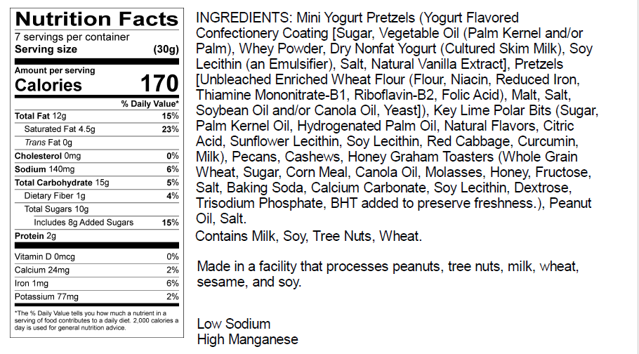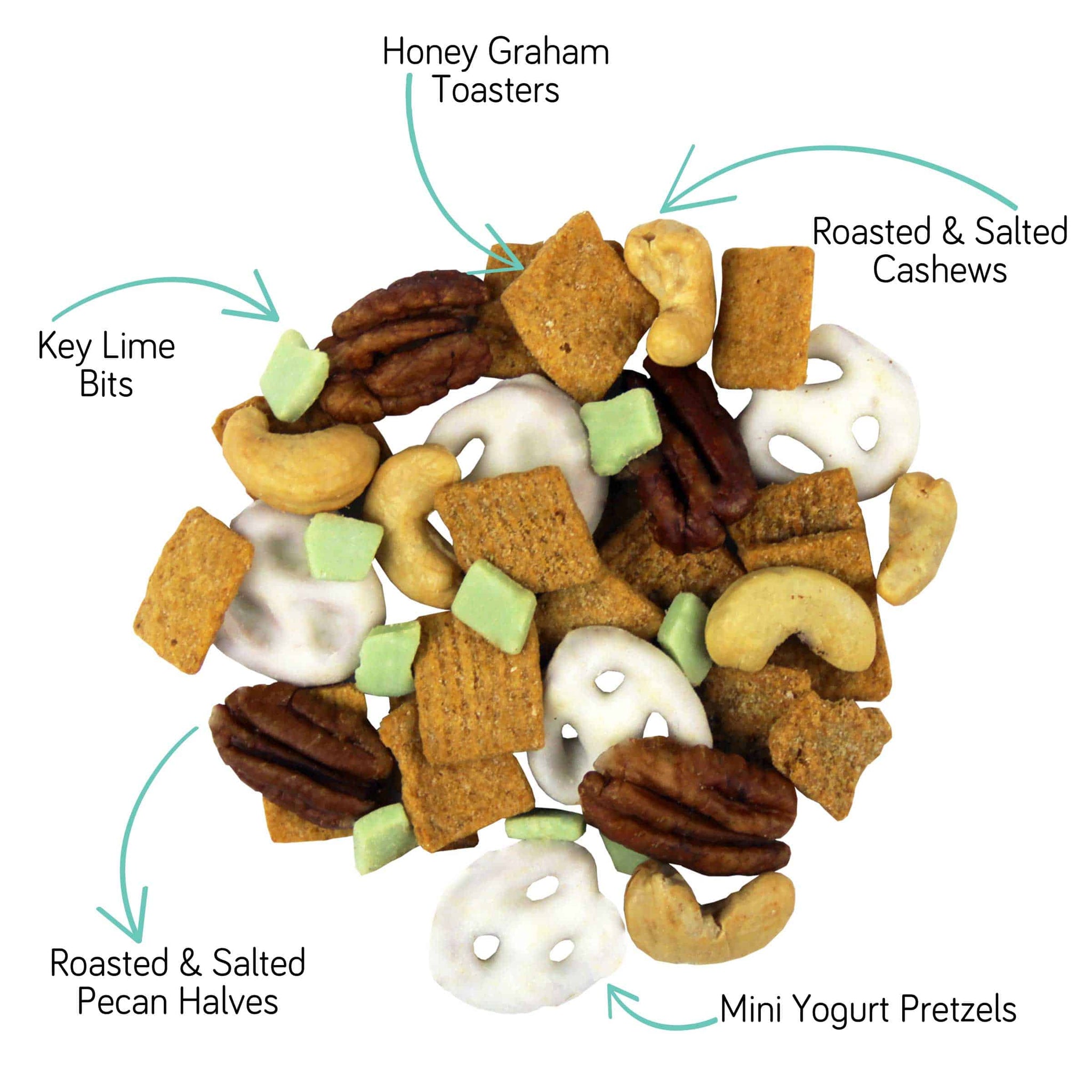 Key Lime Crunch takes a trip down South with sweet and tangy flavors. It’s a blend of textures and tastes with mini yogurt pretzels and smooth key lime bits, blended with crunchy roasted and salted pecan halves, roasted and salted cashews, and honey graham toasters.