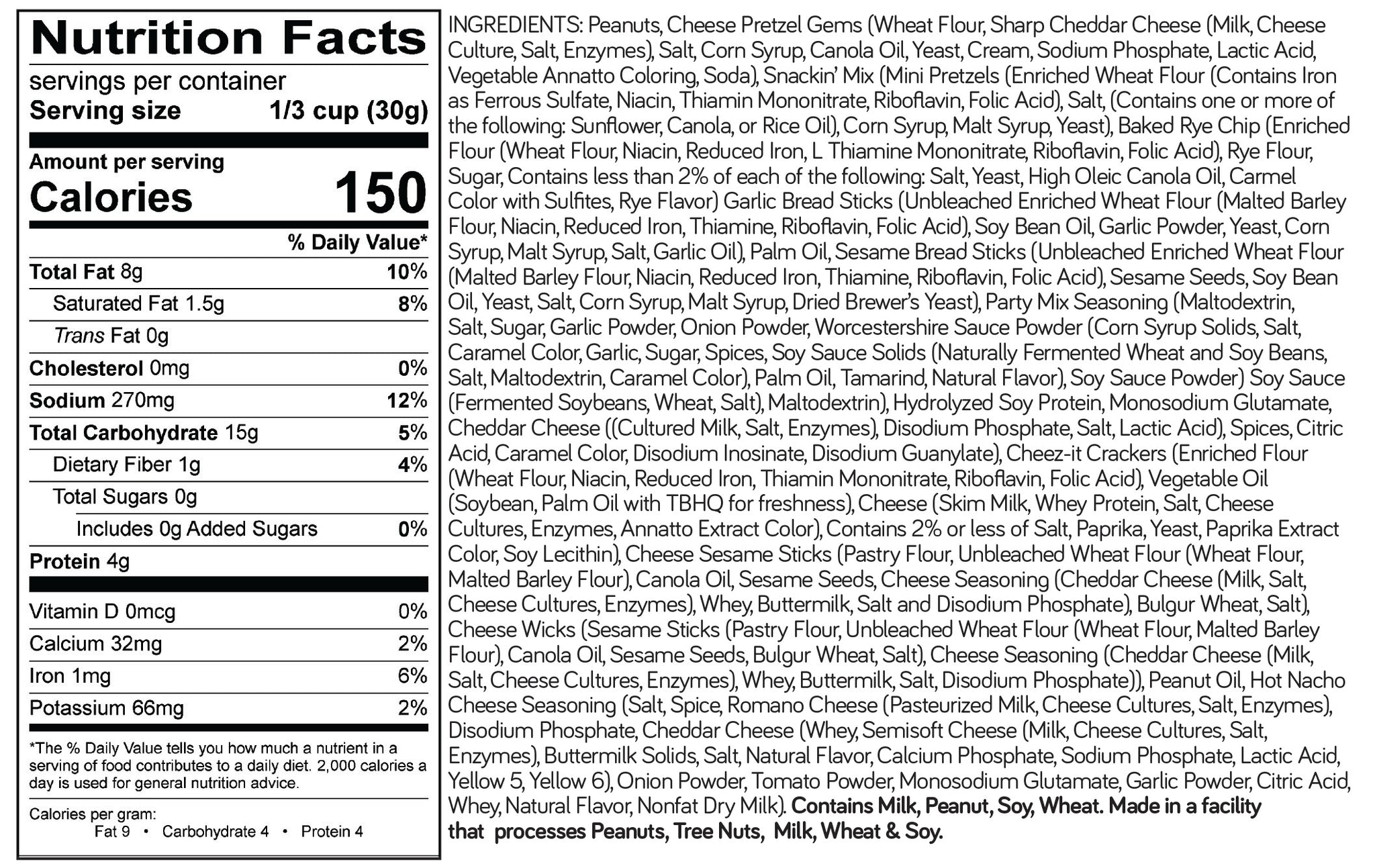 The Big Cheese® is cheese riddled crunchy snack mix consisting of nacho peanuts, cheese pretzel gems, rye chips, sesame seed bread sticks, plain bread sticks, cheese wicks, cheese sesame sticks, and cheese crackers. The 2oz package is perfect for an afternoon snack and easy to throw in your bag.